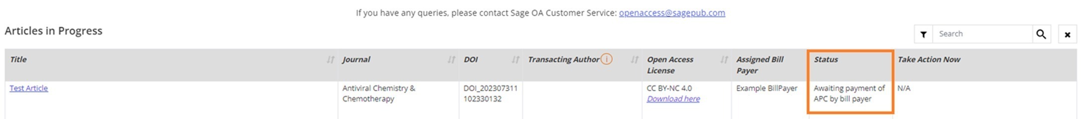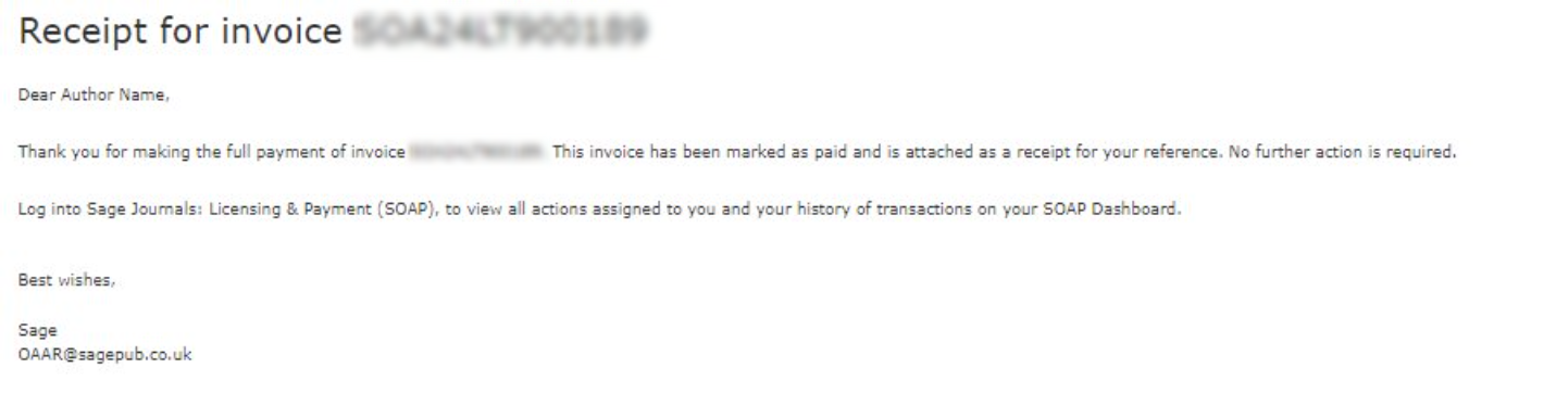 APC payment can either be made by the authors directly or via another bill payer in Sage Journals: Licensing & Payment. When payment is completed against an article, our Sage Journals: Licensing & Payment sends an automated payment confirmation email and a receipt to the bill payer email address.